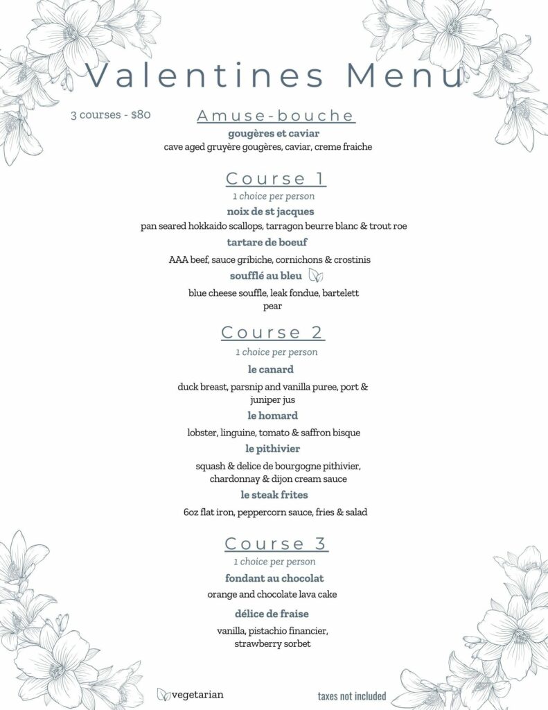 Join us this Valentine’s Day for an intimate three-course dinner for $80 per person.